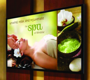 Biển menu dịch vụ massage: in UV chi tiết trên mica, gắn LED chữ – dễ thay đổi nội dung theo mùa.
