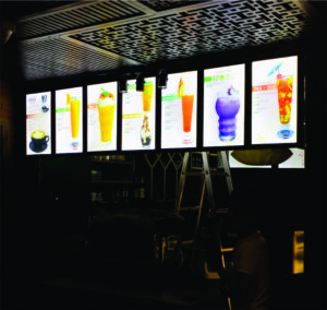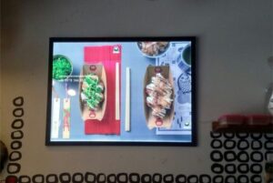 Tranh điện menu treo tường: bố cục chia khối rõ ràng, dễ thay đổi nội dung, ánh sáng đều – không chói.